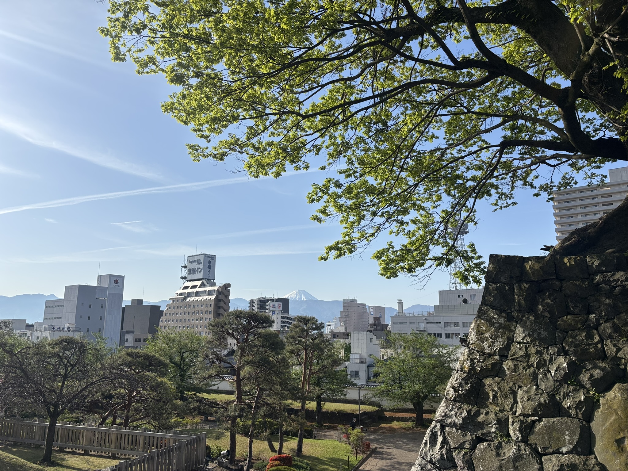 桜も過ぎ初夏へ向けてランニングペースをアップしてきた甲府です。まだ雪がカチンコチンに残る富士山と新緑のコントラストの絶景。だんだん富士山の残雪が溶けてふつうのお山になっていくので、この時期ならではのありがたい風景です。甲府城から。